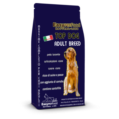 è un alimento Super Premium completo e bilanciato per cani adulti di media e grande taglia da 12-14 mesi in poi. E' studiato per favorire la bellezza del manto dei cani da esposizione. L'elevato e bilanciato contenuto di proteine (suino e pesce) e grassi, conferisce al prodotto oltre che alta appetibilità, il giusto supporto per cani che svolgono una normale e intensa ATTIVITA' fisica. Si tratta di un alimento disidratato bilanciato e ricco di OMEGA 3 e OMEGA 6. TOP DOG ADULT BREED è una miscela di farina di carne di suino e pesce disidratata, materie grasse di origine animale, proteine, oli vegetali, mais estruso, aggiunta di vitamine, minerali e oligo-elementi, per garantire una buona e lunga conservazione.