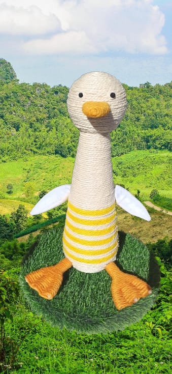 è un simpatico tiragraffi a forma di paperella, realizzato in corda di sisal ed erba sintetica.